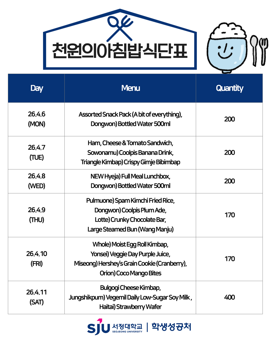 [식단표(천원의 아침밥)] 4월 2주 천원의 아침밥 메뉴 안내 N